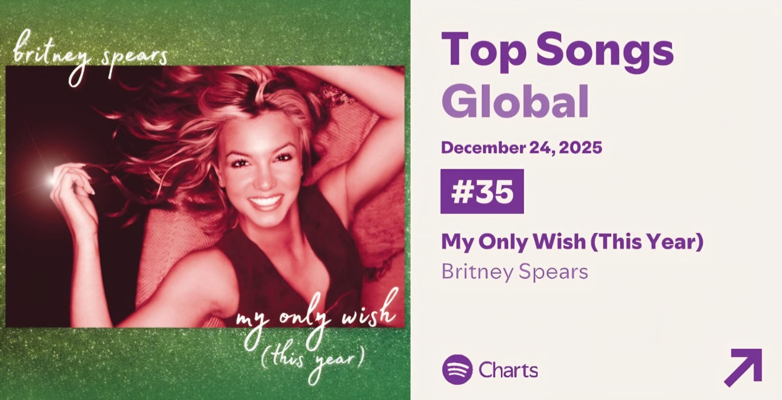 Menurut data chart history dari situs pemantau seperti kworb.net 2026 serta liputan media seperti laman Forbes 2026 yang mencatat pencapaian serupa pada awal 2026 di chart global Billboard (di mana lagu ini mencapai puncak baru), “My Only Wish (This Year)” semakin populer berkat dukungan fans dan rilis lyric video baru pada November 2025, menjadikannya salah satu lagu holiday 2000-an yang paling banyak distreaming di Spotify.