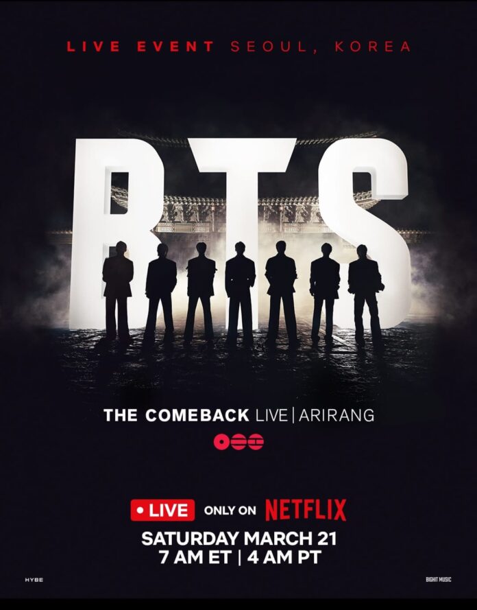 MEDIAAKU.COM – Grup K-pop global “BTS” resmi mengumumkan kembalinya mereka melalui acara spesial “BTS THE COMEBACK LIVE | ARIRANG”, yang akan disiarkan secara real-time online pada Sabtu, 21 Maret 2026, pukul 20.00 KST (Korea Standard Time) / pukul 18.00 WIB, melalui platform “Netflix” pukul 7 AM Eastern Time / 7 AM Pasific Time ( pukul 19.00 WIB ) langsung dari Gwanghwamun Square, Seoul.