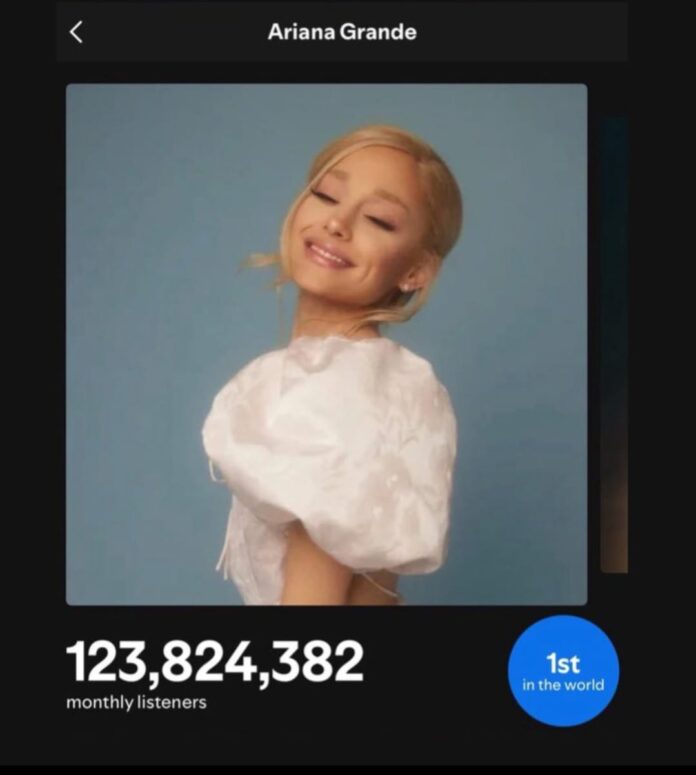 MEDIAAKU.COM – Ariana Grande kembali menduduki posisi puncak sebagai artis dengan pendengar bulanan terbanyak di Spotify secara global, mencatatkan rekor karir baru dengan 123,824 juta monthly listeners/pendengar bulanan.