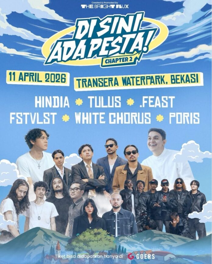 MEDIAAKU.COM – Festival musik “Disini Ada Pesta Chapter 2” siap mengguncang Transera Waterpark, Bekasi, pada Jumat 11 April 2026, dengan line-up megah yang menghadirkan Tulus, Feast, Hindia, FSTVLST, White Chorus, Poris, dan sejumlah musisi ternama lainnya.