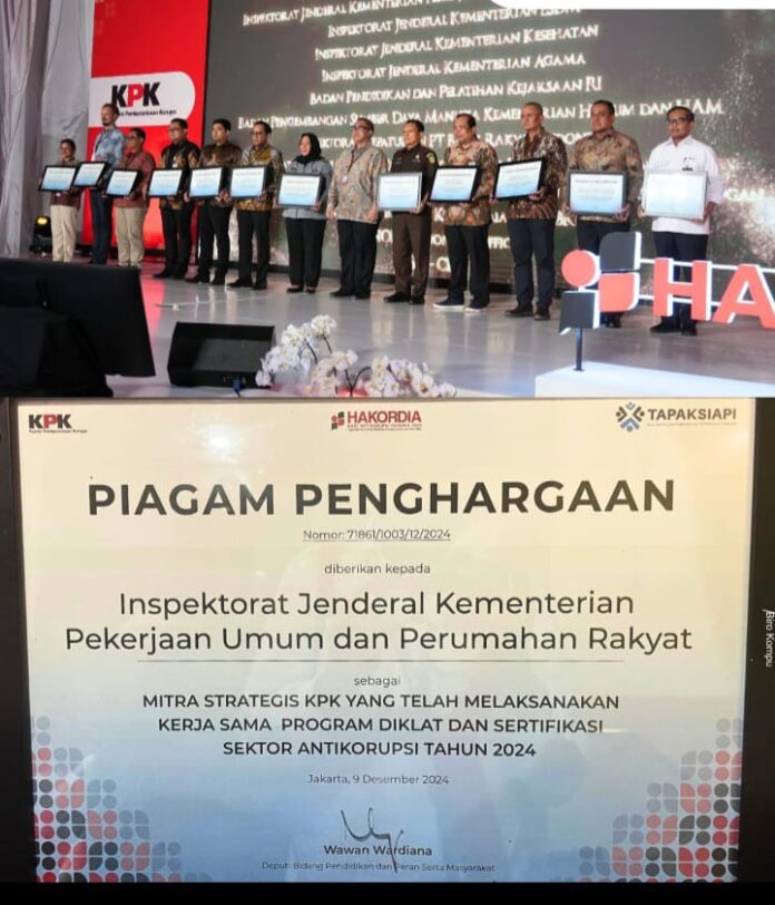 MEDIAAKU.COM – Kementerian Pekerjaan Umum dan Perumahan Rakyat (PUPR) berhasil meraih penghargaan Apresiasi Mitra Kerja Strategis: Program Edukasi Antikorupsi dan Pencegahan Korupsi dalam acara Temu Aksi Penyuluh Antikorupsi dan Ahli Pembangunan Integritas (TAPAK SIAPI) 2024. Acara tersebut diselenggarakan oleh Komisi Pemberantasan Korupsi (KPK) di Gedung Merah Putih, Jakarta, baru baru ini.