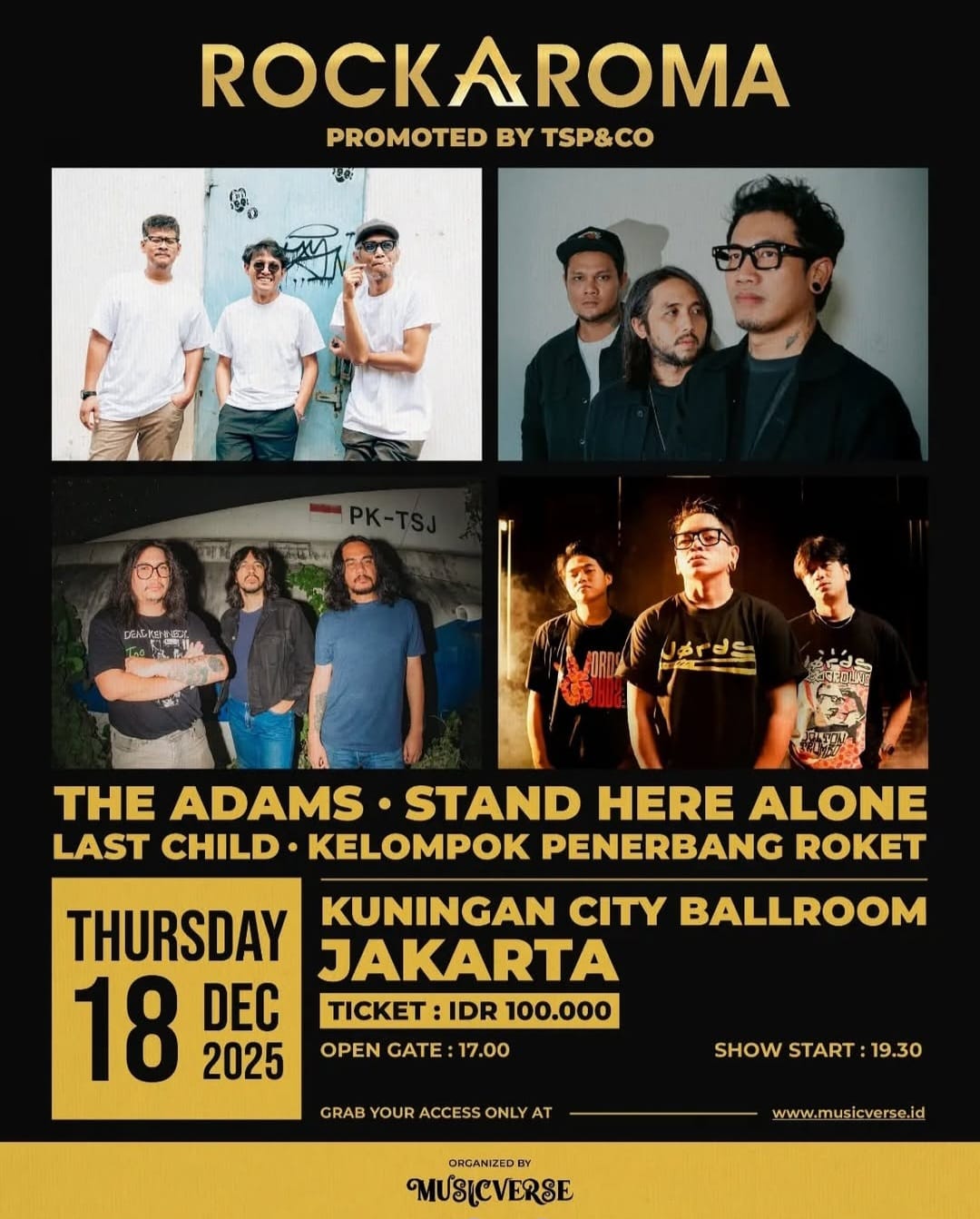 Acara ini, yang diselenggarakan sebagai bagian dari RockAroma “Bebasin Rasa Lo Tour 2025”, menjanjikan malam penuh energi dengan penampilan empat band rock terkeren, termasuk band-band pilihan dari voting penggemar yang telah digelar sepanjang tahun.
