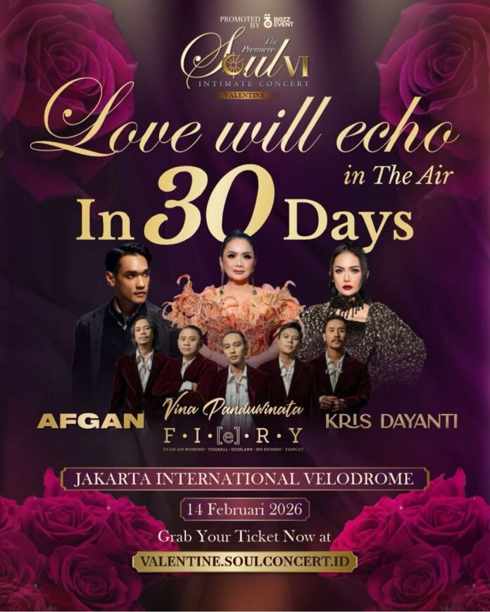 MEDIAAKU.COM — Dalam hitungan hari menuju Hari Valentine, penyelenggara “The Premiere Soul VI” secara resmi mengumumkan konser bertajuk “Love will echo in the air in 30 days” yang akan digelar pada 14 Februari 2026 di Jakarta International Velodrome, Rawamangun, Jakarta Timur.