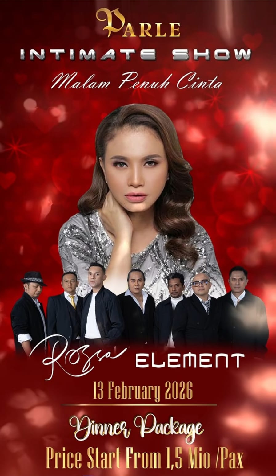 MEDIAAKU.COM — Penikmat/penggemar musik diprediksi akan memenuhi “Parle Senayan” Jakarta pada Selasa malam 13 february 2026 dalam acara bertajuk “Malam Penuh Cinta”, menampilkan penyanyi legenda “Rossa” bersama grup “Element” dalam kolaborasi yang menghadirkan nuansa romantis dan nostalgia.