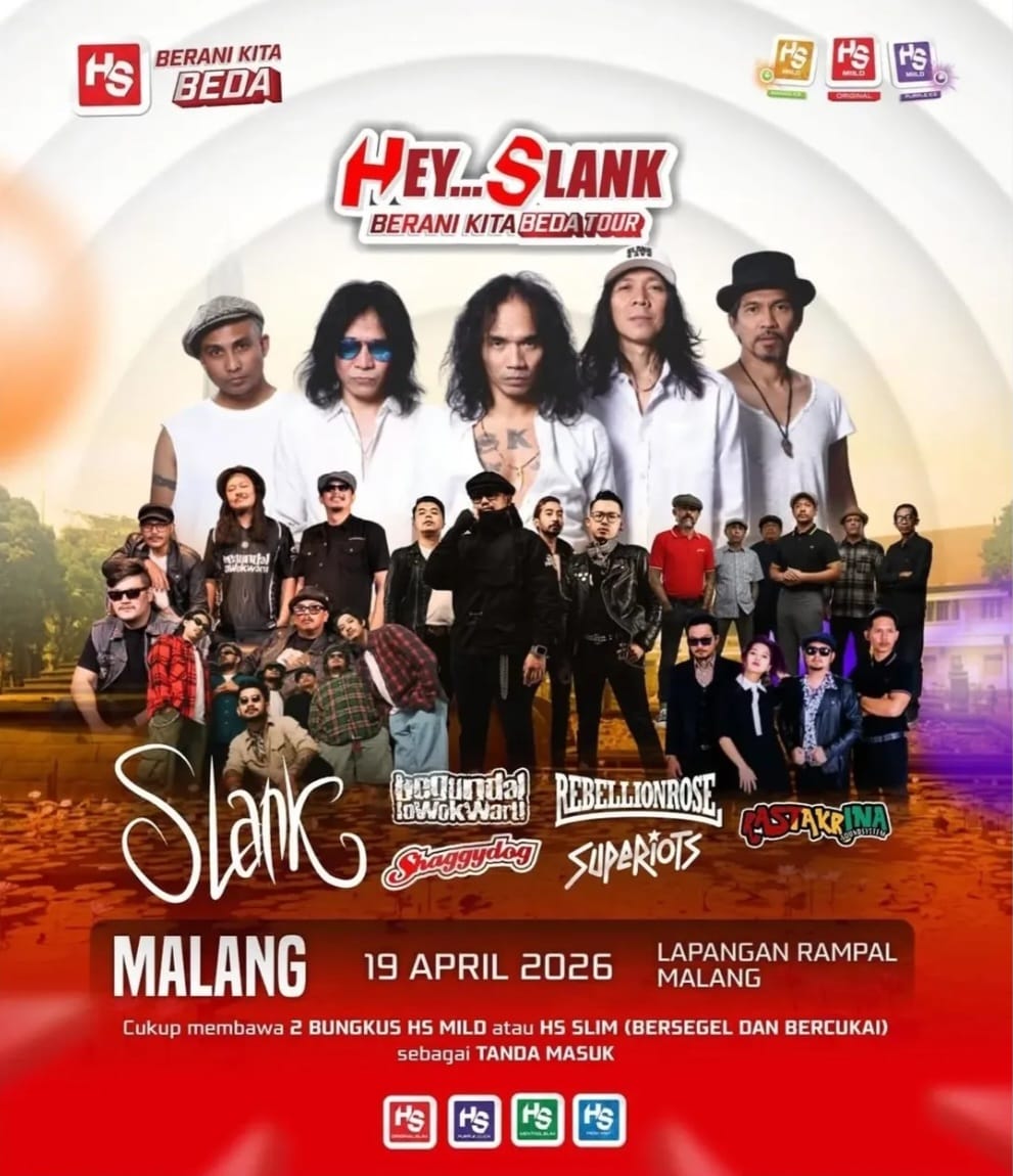 MEDIAAKU.COM – Grup band legendaris Slank akan menghibur para Slankers di Kota Malang melalui konser “Berani Beda Tour” bertajuk “Hey Slank Malang” yang dijadwalkan berlangsung pada Minggu, 19 April 2026 di Lapangan Rampal.